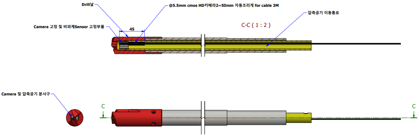 사용, 튜브 외경과 드릴바 내경 사이에 베어링 삽입, 드릴의 센터링과 카메라 전선이 내경을 통과하며 튜브 내경으로 공기 라인을 형성 분해 조립이 용이하게
