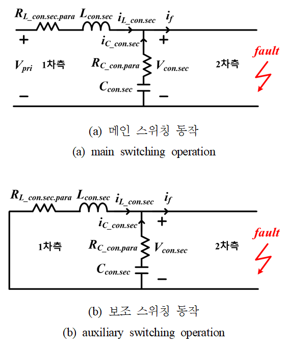 강압형 구간 컨버터의 내부 임피던스 등가회로는 그림 5와 같이 나타낼 수 있다. 여기서, 그림 5의 (a)와 (b)는 각각 강압형 컨버터의 메인 스위칭 동작과 보조 스위칭 동작을 나타낸다. 즉, 그림 5의 (a)와 같이 메인 스위칭 동작 상태에서 사고가 발생하면, 구간 컨버터의 인덕터($L_{con.\sec}$)는 사고전류 방향과 직렬 구조, 커패시터($C_{con.\sec}$)는