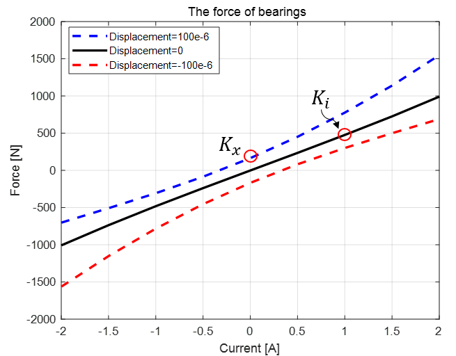 여기서, $K$는 자기베어링의 자기회로 구성 조건에 따라 주어지는 상수로서 $K =\mu_{0}N^{2}A$ 이고, $m$은 회전자의 질량을 각각