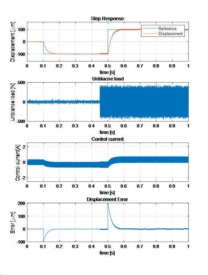 PID제어에 의한 계단 응답에서 입력 지령 대비 약 47%의 오버슈트가 발생하고 있으며, 이는 축방향 자기베어링 변위의 한계인 터치베어링(touch