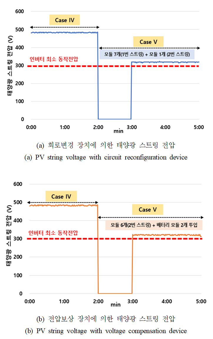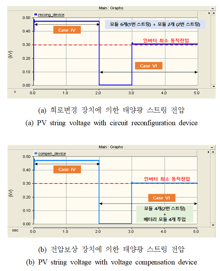 [Step 10] 인버터 최소 동작전압 이상의 스트링을 구성하기 위한 최소 보상전압($V_{comp,\: \min }(t)$)은 식 (4)에 따라 회로변경 장치를 실행한 후 남은 정상 모듈의 전압을 고려하여 산정한다. 또한, 전압보상 장치의 배터리 탭($I_{bat,\: tap}(t)$)은
