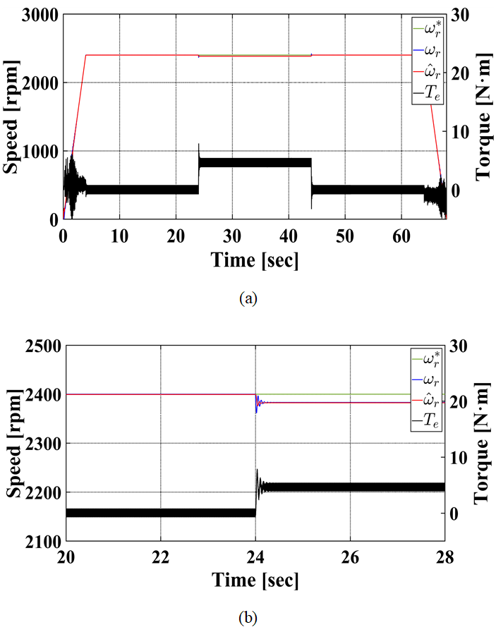 나타낸다. 그림 8(a)는 전체 실험 시간 동안의 속도 오차, 그림 8(b)는 정격 부하의 30%를 인가하였을 때의 속도 오차이다. 영속도 부근에서 자속 추정이 어려워 속도 오차가 120rpm까지 커졌으나, 이는 빠르게 줄어들어