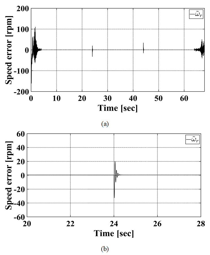 (a)는 전체 실험 시간 동안의 속도 오차, (b)는 정격 부하의 50\%를 인가하였을 때의 속도 오차이다. 정격 부하가 50%로 증가해도 30%를