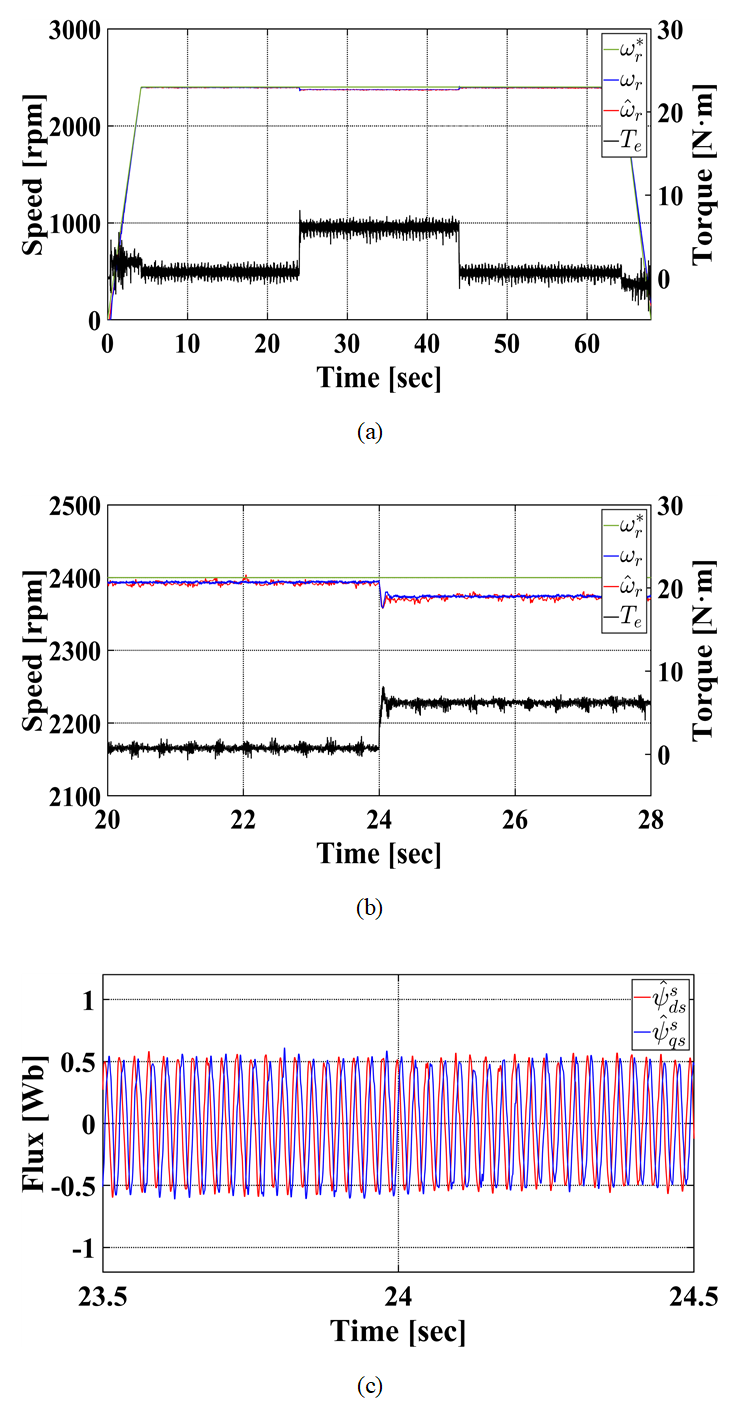그림 9는 정격 부하의 50%를 인가하였을 때의 실험 결과를 나타낸다. 그림 9(a)는 전체 실험 시간 동안의 회전자 속도 및 토크 응답이며, 그림 9(b)는 정격 부하의 50%를 인가하였을 때의 회전자 속도 및 토크 응답, 그림 9(c)는 추정 자속이다. 그림 9(a)를 통해 부하가 30%에서 50%로 더 커졌음에도 전 구간에서 안정적으로 속도를 추정함을 확인할 수 있으며, 그림 9(b), 그림 9(c)를 통해 부하가 더 급격히 변화하는 상황에서도 여전히 속도 및 자속을 안정적으로 추정함을 확인할 수 있다.