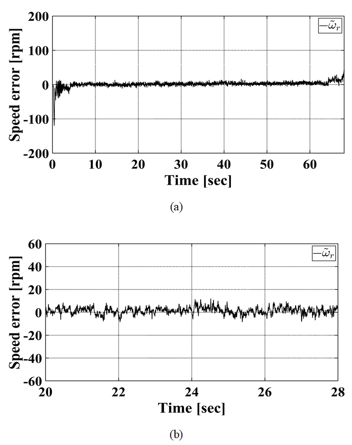 그림 8은 실험에서 정격 부하의 30%를 인가하였을 때 의 실제 속도와 추정 속도간의 속도 오차$(\omega_{r}-\hat{\omega}_{r})$를