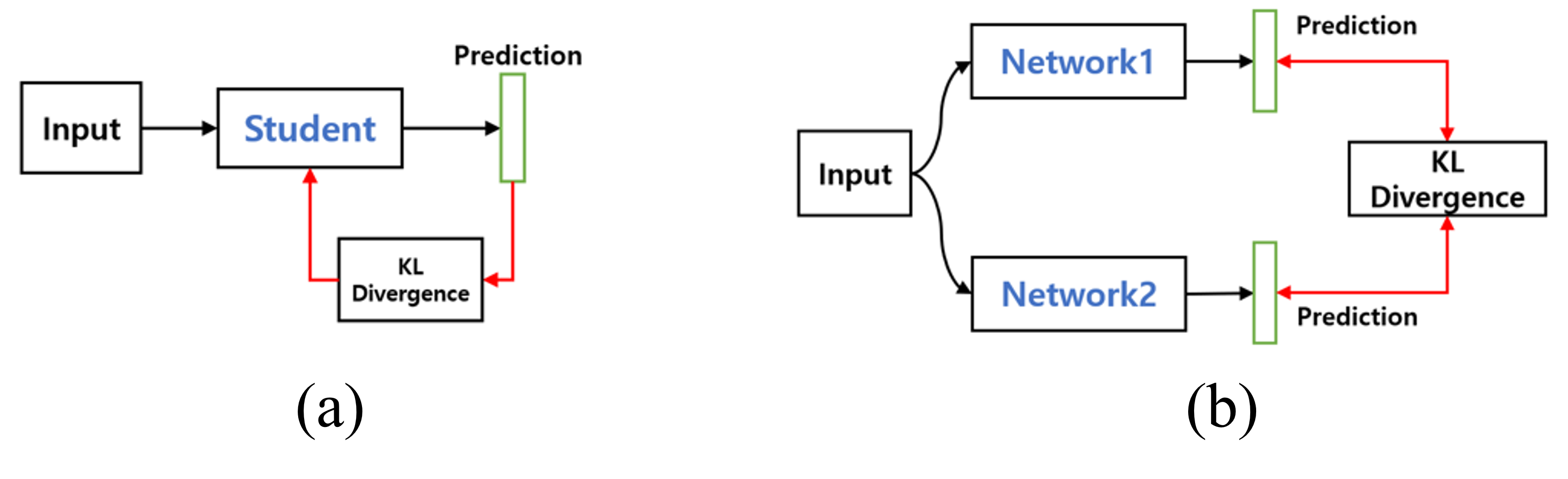 ๊ทธ๋ฆผ 3. ๋จ์ผ ๋ชจ๋ธ ๊ธฐ๋ฐ ๋ ์ง์์ฆ๋ฅ (a) self-KD, (b) mutual-KD