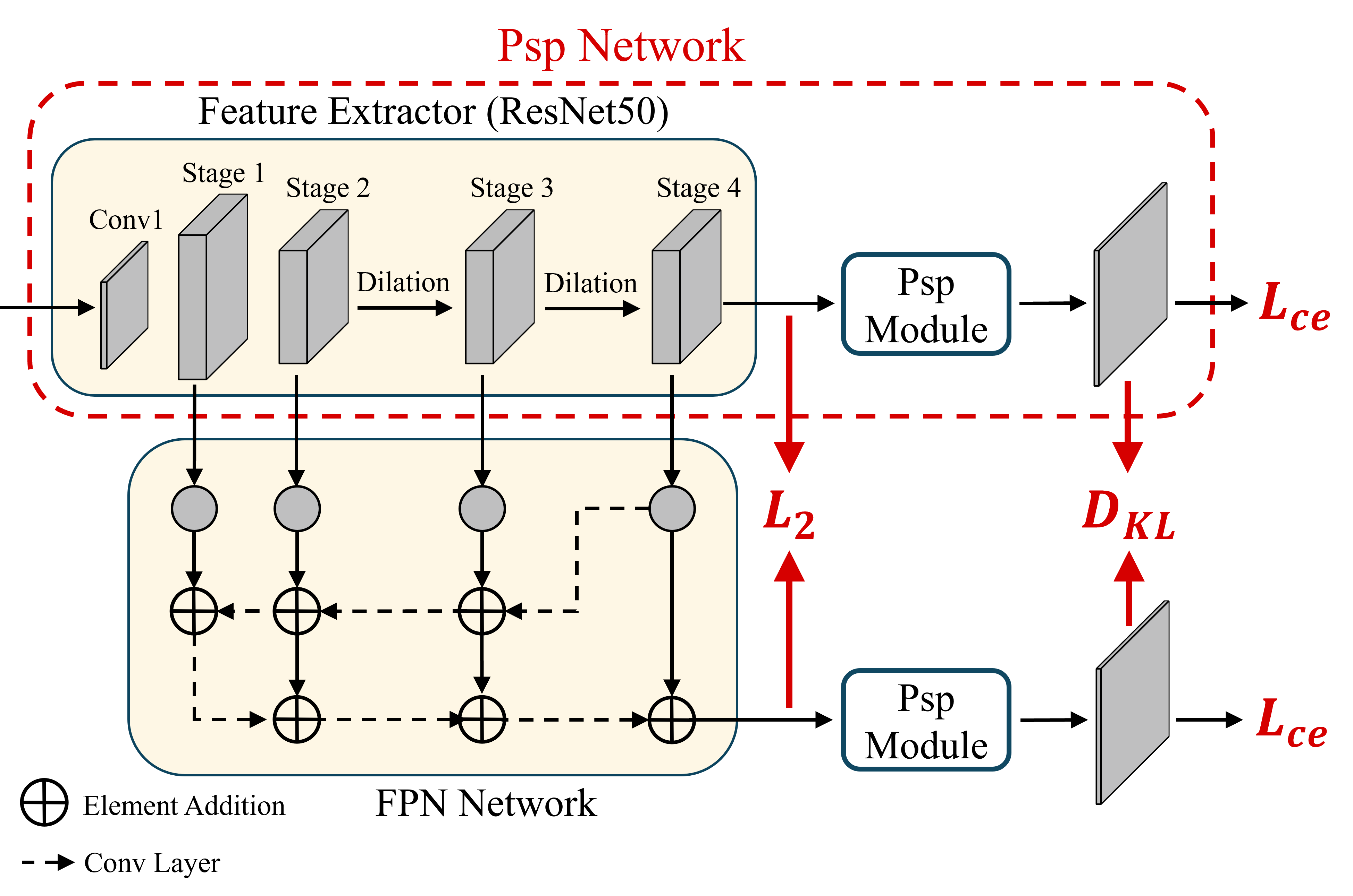 ผ๋ฌธ์์ ๋์์ผ๋ก ํ๋ PspNet์ ResNet50์ ์ฌ์ฉํ์ฌ ํน์ง์ ์ถ์ถํ๊ณ  ์ด 4๋ฒ์ ํ๊ท  ํ๋ง(Adaptive Average Pooling)์