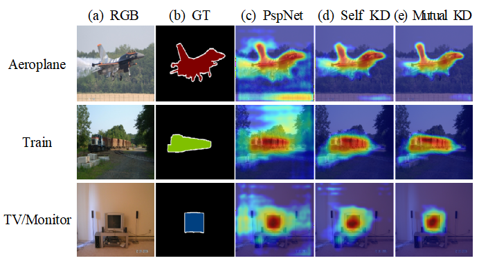 ๋ ฅ์ผ๋ก ์ฌ์ฉ๋๋ ์ด๋ฏธ์ง, (b)๋ ์ ๋ต, ๊ทธ๋ฆฌ๊ณ  (c), (d), (e)๋ ์์๋๋ก PspNet, Self-KD, Mutual-KD ๊ธฐ๋ฒ์ Grad-CAM์ ํํธ๋งต ๊ฒฐ๊ณผ๋ฅผ ๋ํ๋ธ๋ค.