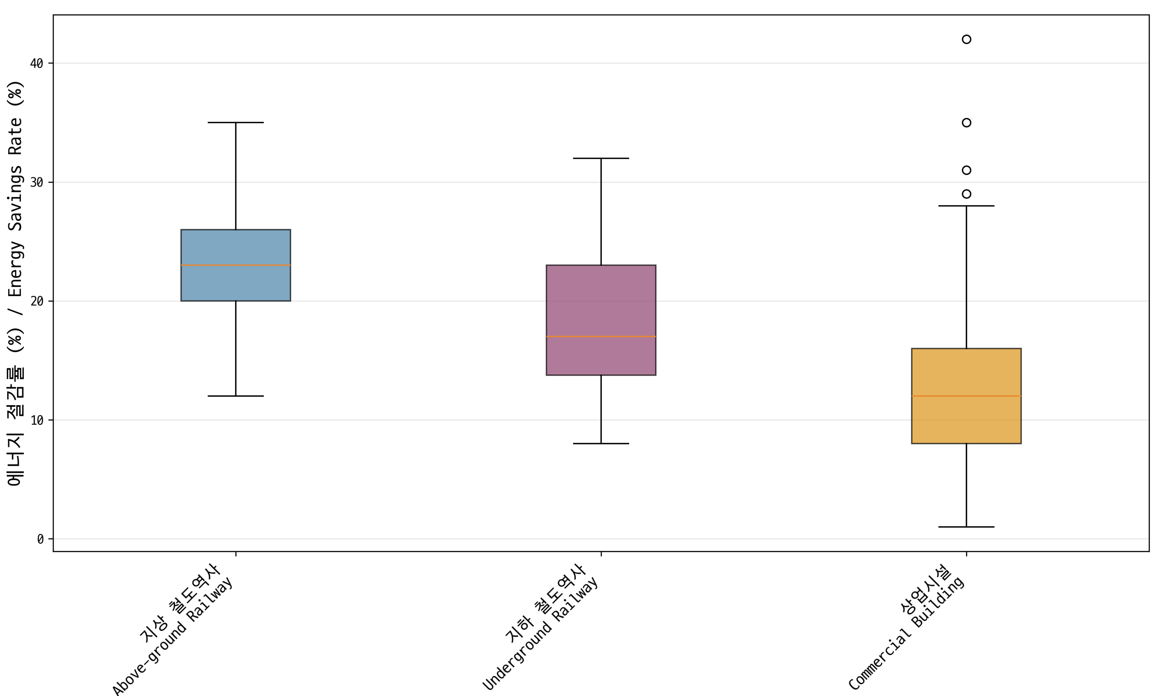 철도역사 특성별로는 지상역사(24.8%)가 지하역사(19.3%)보다 유의하게 높은 절감률을 보였고, 대형 역사(>20,000m²)에서 26.3%로