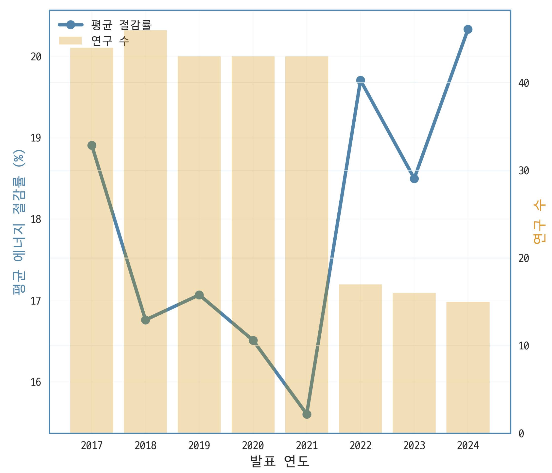 그림 3. 연도별 연구 수와 평균 에너지 절감율