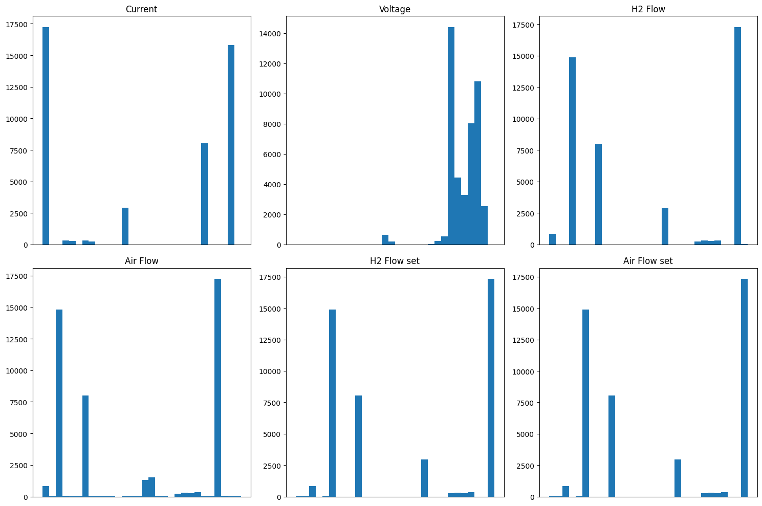 변수 대표로 진행하였고, 주요 측정 변수의 히스토그램은 그림 4에 나타내었다. 주요 측정 변수에서는 Current, H2 Flow, Air Flow와 Flow Set 변수에서 다중 분포인 형태를 보이고 있다.