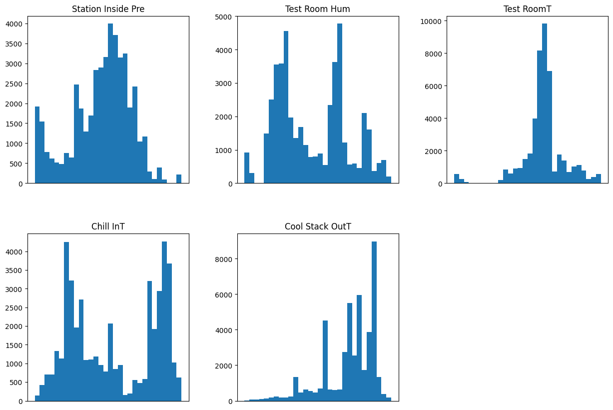 두 번째로는 히스토그램을 통해 모든 실험에서 측정 변수 데이터의 분포와 이상치 등을 파악하였다. 선 그래프와 동일하게 주요 측정 변수, 환경 측정