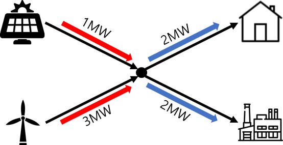 Power Tracing은 특정 발전기에서 생산된 전력이 어느 위치의 부하로 얼마만큼의 전력이 공급되는지를 정량적으로 분석하는 기법이다. 그림 1은 분산전원에서 부하까지의 전력 흐름을 단순화하여 나타낸 것으로 모선 기준 유입 전력을 붉은색, 유출 전력을 파란색으로 표현하였다[7].