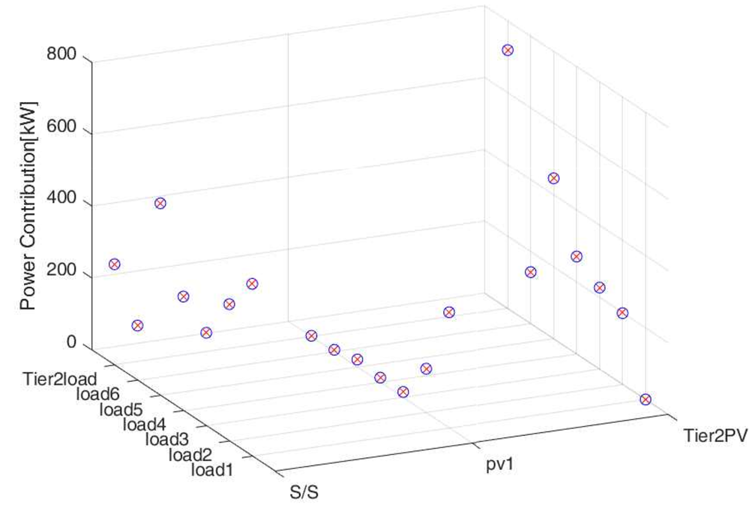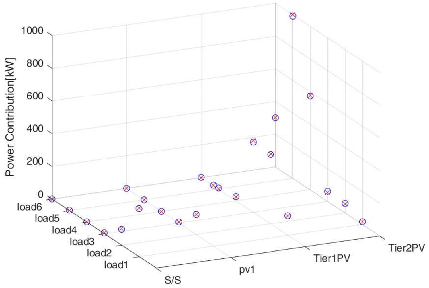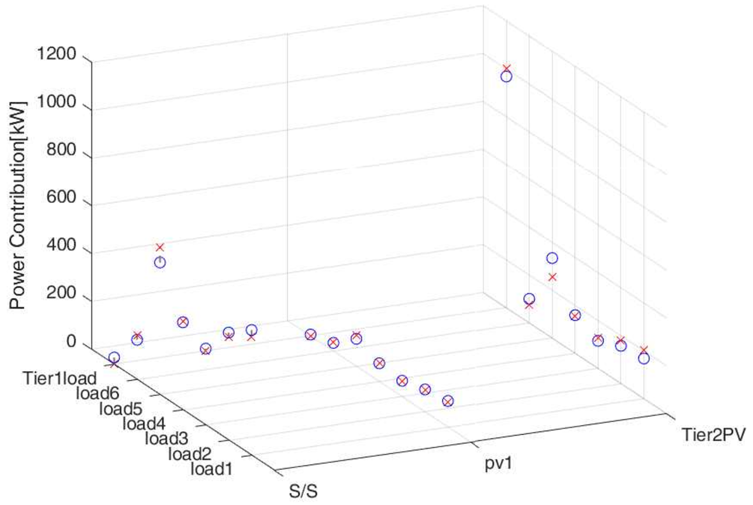 전력 분배 예측값을 의미하며, 빨간색 X 표시는 조류해석 기반 Power Tracing 알고리즘의 전력 분배 값이다.