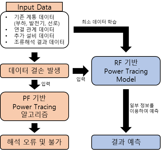 본 논문에서 제안하는 RF 회귀 모델은 조류해석 과정을 거치지 않기 때문에 기존 Power Tracing과 입력 데이터 구성이 다르며, 표 1에 조류해석 기반 Power Tracing과 머신러닝 기반 Power Tracing의 입력 데이터 필요 여부를 나타내었다.