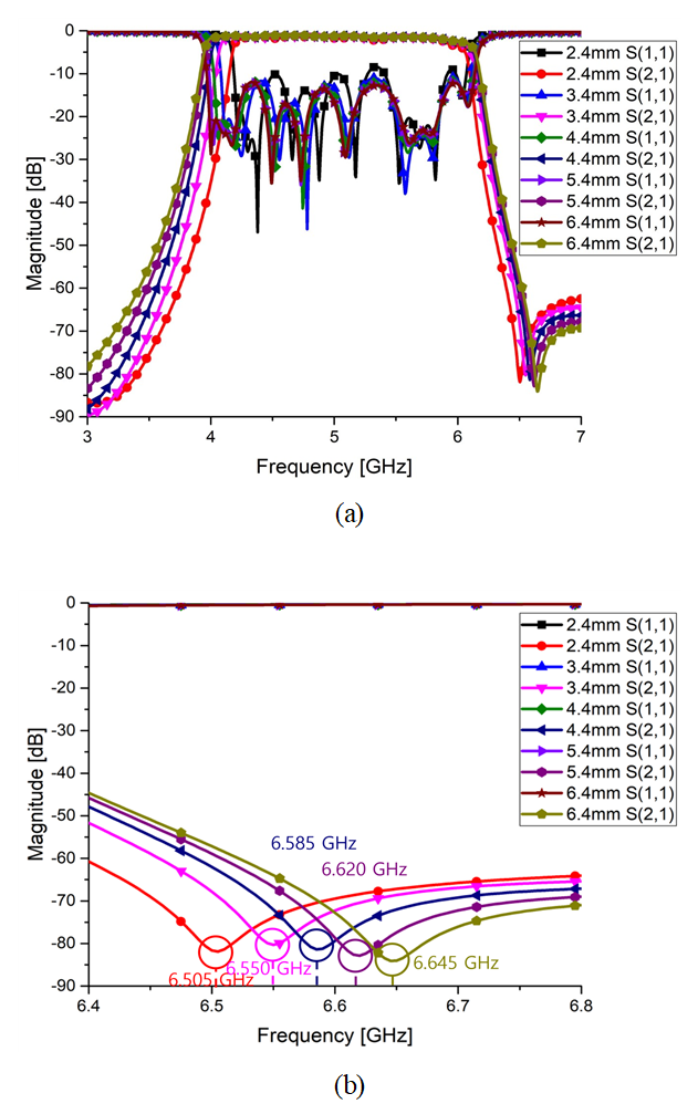 ํต๊ณผ๋์ญ์ ๋ณํ๋ ์์ง๋ง transmission zero์ ์ง์ ์ด ์ด๋ํ๋ ๊ฒ์ ๋ณผ ์ ์๋ค. ๋์ด๊ฐ 2.4 mm์ธ ๊ฒฝ์ฐ 6505 MHz, 3.4