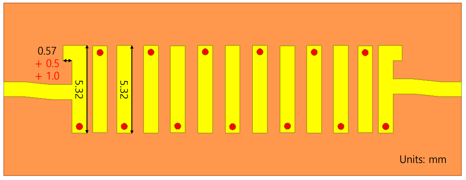 loss๋ฅผ ๊ฐ์ ํ๊ธฐ ์ํ์ฌ microstrip ๊ตฌ์กฐ ์์ cover๋ฅผ ๋ฎ์ ๊ตฌ์กฐ๋ก ์ค๊ณ๋๋ฉฐ ํฌ๊ธฐ๋ $28.5\times 10.5\times 4.4\left[mm^{3}\right]$์ด๋ค.