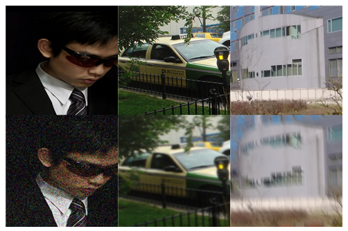 (1)에서 blur kernel $h$에 의해서 영상 blurring 정도와 형태가 결정되는데 blur kernel의 특성에 따라서 motion blur 혹은 Gaussian blur 등의 손상 형태가 결정된다. Blur kernel을 모르는 상태에서 손상된 영상으로부터 원영상 $x$를 추정해야 하는 blind deblurring 문제는 무수히 많은 $x$와 $h$로부터 최적의 해를 추정해야 하는 severely ill-posed problem이다[3,5]. 가산 잡음 $n$에 의해서 손상된 영상을 복원하는 denoising에 대한 다양한 연구도 진행되어 왔다[7]. 그림 1에 가산 잡음에 의해서 영상이 손상되는 경우와 motion blur 혹은 Gaussian blur에 의해서 영상이 손상되는 등의 다양한 원인에 의해서 손상된 영상을 도시하였다.