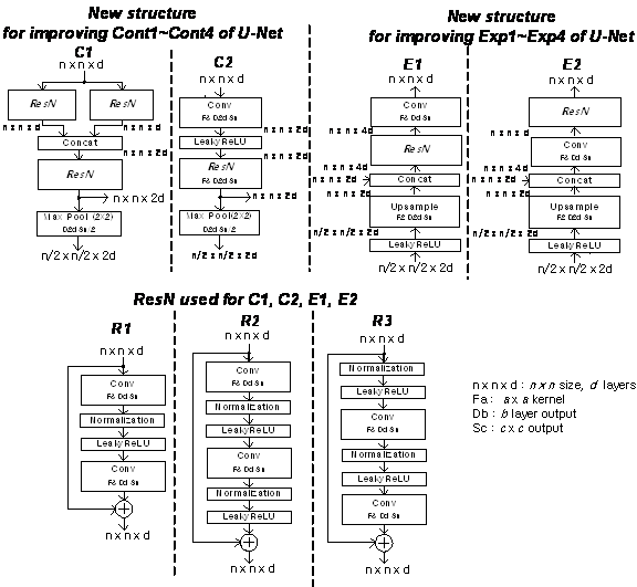 영상 복원 혹은 영상 인식 등을 포함한 영상 처리를 위한 딥 러닝 기법은 주로 CNN(convolutional neural network)을 사용한 기법이 주로 연구되어 왔는데 최근에는 transformer 구조를 사용한 딥 러닝 기법이 많은 주목을 받고 있다. 영상 복원 분야에서도 transformer 구조를 사용한 딥 러닝 기법이 연구되고 있는데[19-21], transformer 구조는 CNN 구조와 완전히 다른 접근 방법을 사용한 방법이고 우수한 성능을 보이지만 전체적인 복잡도는 크게 증가한다. 본 논문에서는 영상 복원을 위해서 CNN 구조를 사용할 때 영상 복원 성능을 극대화하기 위해서 기존의 구조를 개선하는 방법을 연구한다. 딥 러닝을 이용하여 영상을 복원할 때 영상 복원 성능을 극대화하기 위하여 먼저 3장에서 설명한 U-Net의 구조를 개선한 구조를 제안한다. 그림 4에 기존의 U-Net의 구조를 개선하기 위해서 contractive path와 expansive path의 각 stage에서 사용되는 새로운 구조를 제시하였다. 제안하는 U-Net은 [18]에서 제안한 구조를 개선하였는데, ResNet에서 사용되는 short cut 구조를 U-Net의 contractive path와 expansive path의 각 stage에 적용하여 딥 러닝 과정에서 수렴 성능을 향상시킨다. Short cut을 U-Net에 적용하기 위한 다양한 구조에 대해서 성능을 분석하여 그중에서 우수한 성능을 보이는 구조를 정리한 ResN 구조를 그림 4에 제시하였다. 제안하는 구조에서는 contractive path와 expansive path의 각 stage에 ResN 블록이 적용되어 수렴 성능을 향상시킨다. 그림 4에서 제시하는 것과 같이 전체 구조에서의 ResN 블록의 위치 및 사용 방법, ResN 블록의 내부 구조 및 ResN 블록에서 사용되는 정규화 (normalization) 방법에 따라서 제안하는 구조는 다양하게 구성될 수 있다. 특히 contractive path에 사용하는 ResN을 병렬 구조로 연결하여 contractive path의 각 stage 당 2 배로 증가하는 channel 수에 대응하면서 short cut 구조를 유지할 수 있는 구조도 제시하였다.