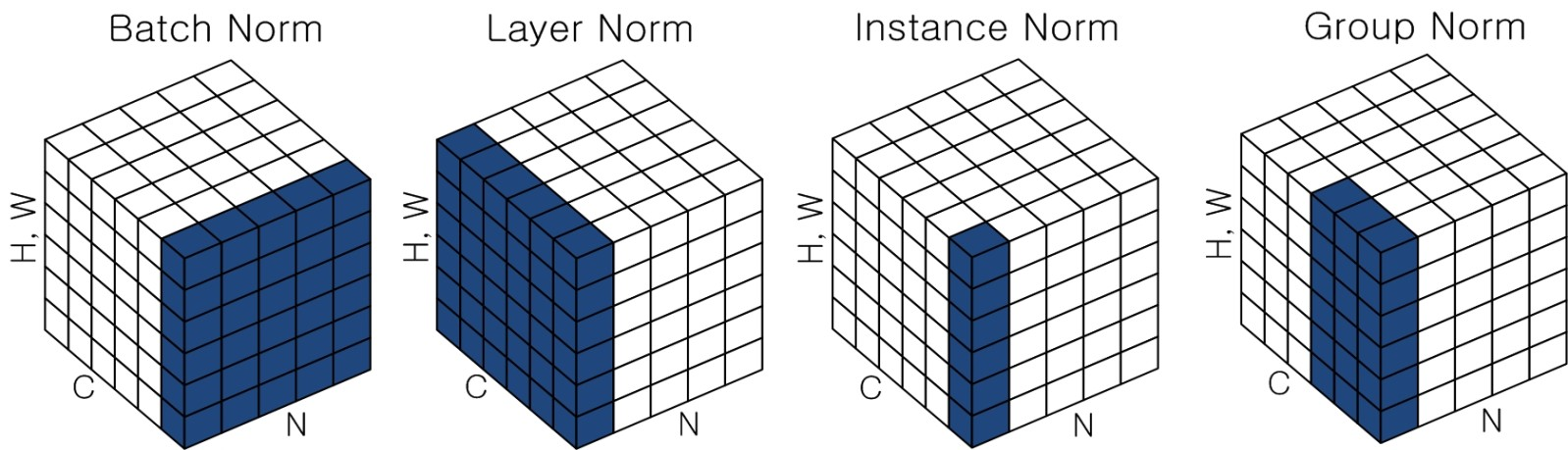 이러한 batch normalization 방법을 이용하여 internal covariance shift 현상을 개선하면 deep neural network의 계층이 깊어질 때 학습이 어려워지는 점을 개선할 수 있다. Batch normalization 기법이 제안된 이후로 다양한 normalization 기법이 제안되었다[26-29]. 식 (2)와 식 (3)의 평균과 분산이 계산되는 데이터 집합 $S_{i}$에 의해서 각 normalization 기법을 구분할 수 있다. 그림 5에 각 normalization 기법에 따른 집합 $S_{i}$를 비교하였다[28]. Layer normalization은 각 channel에 대한 평균과 분산을 구하기 때문에 $S_{i}$가 batch의 크기와 무관한 특성이 있다[26].