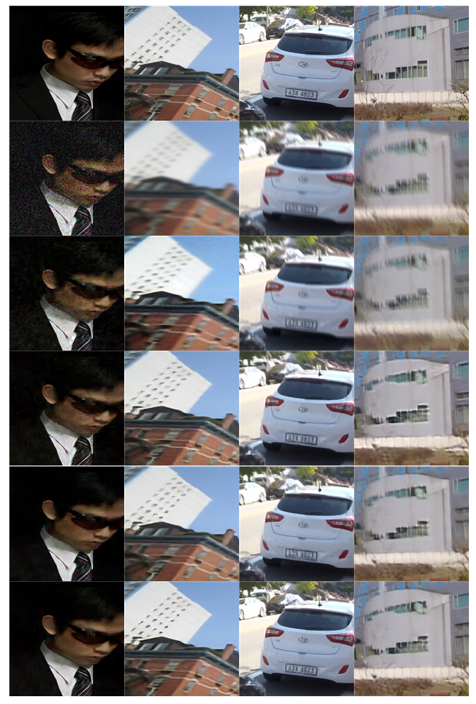 그림 6. 영상 복원 성능 비교 (위부터 : 원본 영상, 손상된 영상, DnCNN[7]을 이용하여 복원된 영상, DeblurGAN[14]을 이용하여 복원된 영상, 기존의 U-Net[24]을 이용하여 복원된 영상, 제안하는 구조를 이용하여 복원된 영상)