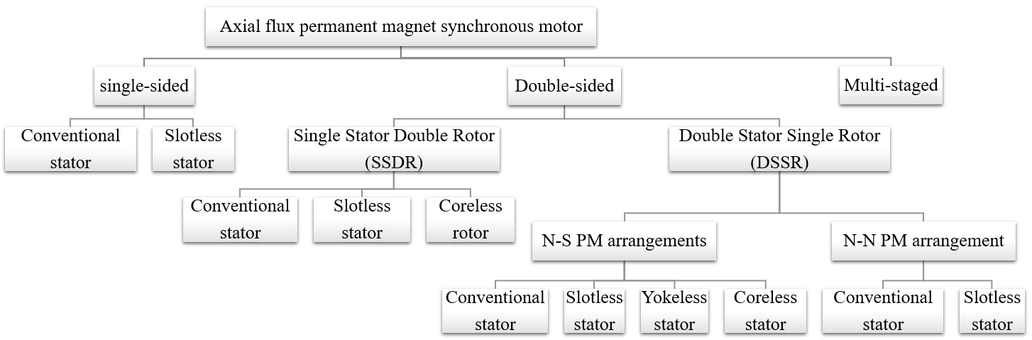 AF-PMSM은 회전자와 고정자의 개수에 따라서 토폴로지가 분류된다[8]. 그림 1은 AF-PMSM의 토폴로지에 따른 분류를 나타낸 그림이다. 고정자와 회전자가 1개씩 있는 구조는 single-sided로 분류된다. 이 구조는 축방향으로