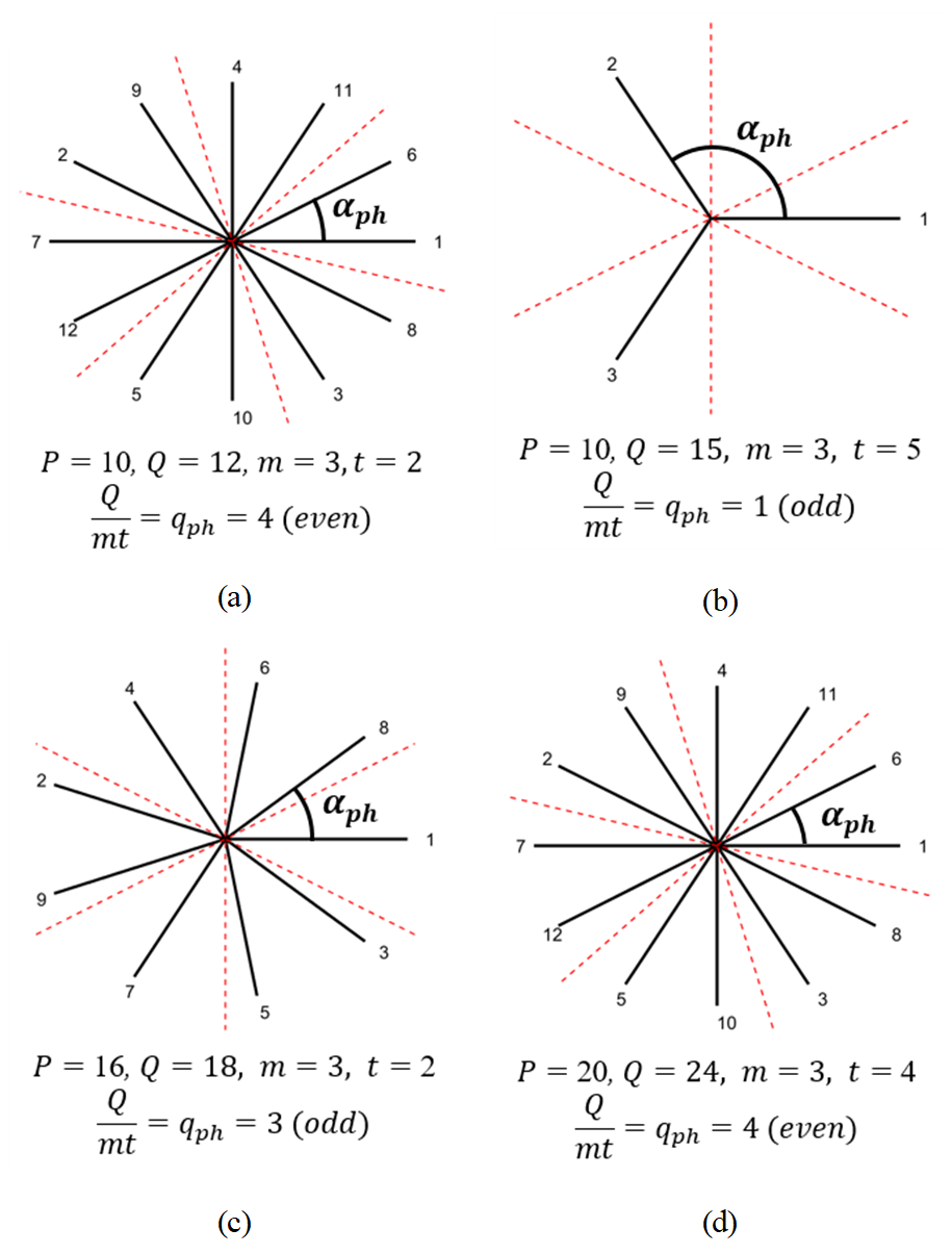 여기서 kd는 분포 계수, t는 모터 주기로 극 쌍수와 슬롯 수의 최대공약수, m은 상수, qph는 상당 모터 주기 당 슬롯 수, αph는 인접한