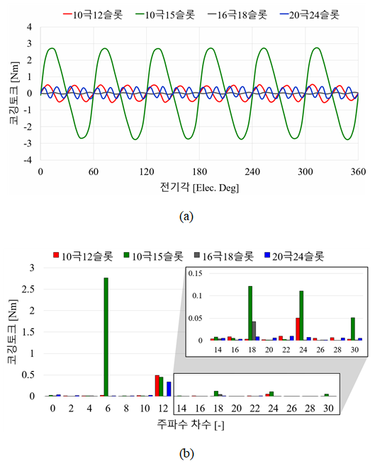 때 코깅 토크는 극 수와 슬롯 수의 최소공배수로 주파수 성분이 나타났으며, 극 수와 슬롯 수의 최소공배수가 가장 큰 16극 18슬롯이 가장 작은 코깅