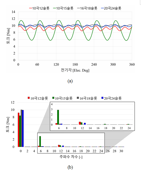 토크를 가졌다. 또한, 부하 특성을 비교했을 때 권선 계수가 가장 큰 16극 18슬롯이 큰 토크를 가졌으며 역기전력 고조파와 코깅 토크가 작아 토크