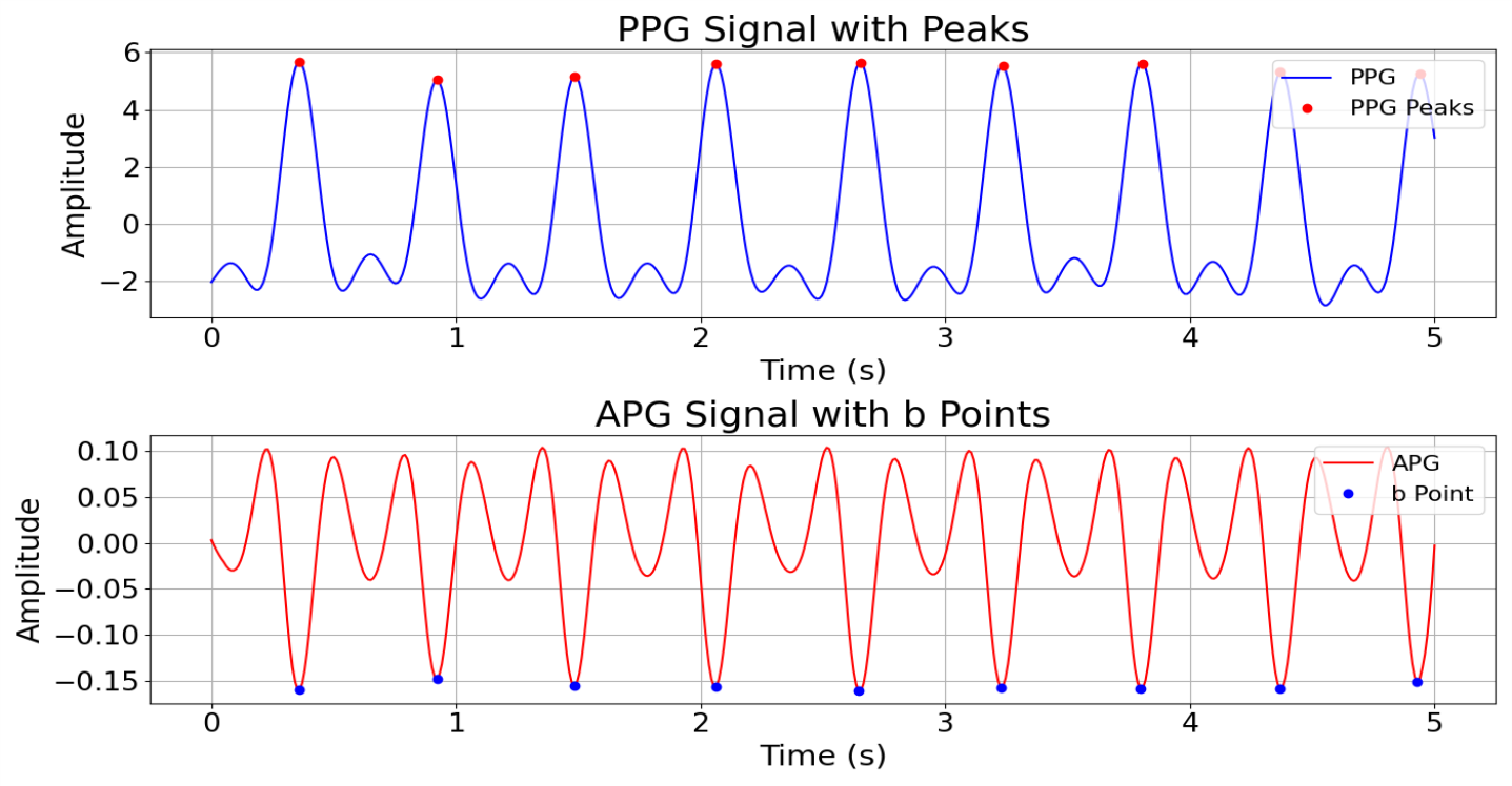 그림 3은 PPG와 APG의 특징점 관계이다. Python의 find peaks 함수에 임계값을 적용하여 R-Peak 탐색 후, 해당 시점과 가장 근접한