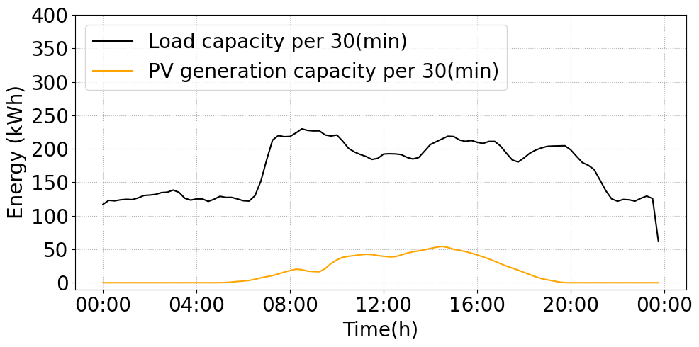์ ์ฉ๋์ 200kW๋ก ์ค์ ํ์์ผ๋ฉฐ, ESS ์ฉ๋์ ๊ธฐ์กด ๋ฌธํ[12]์์ ์ ์ํ ์ต์ ๊ธฐ์ค์ธ PV ์ฉ๋์ 2.5๋ฐฐ๋ก ์ค์ ํ์๋ค.