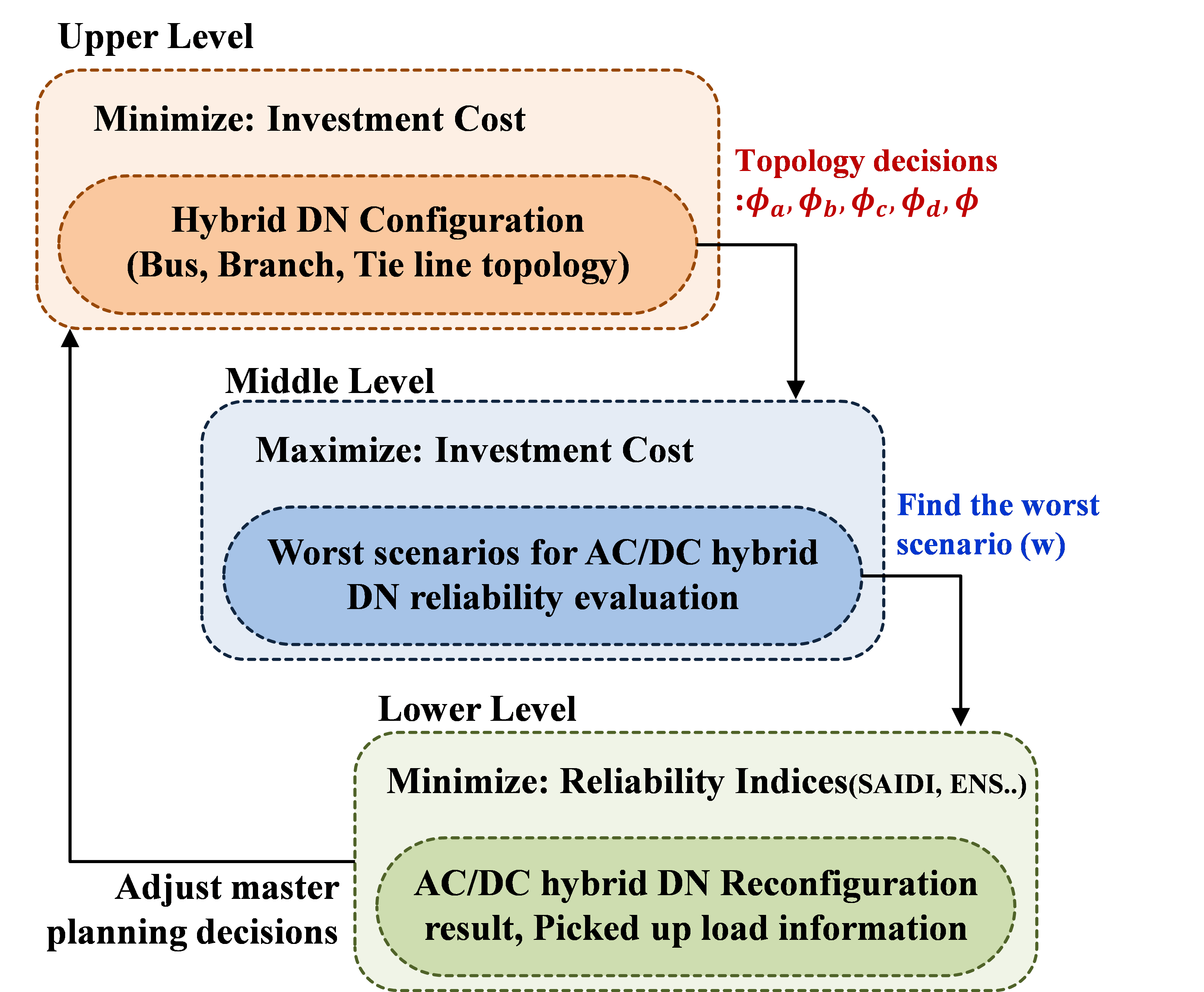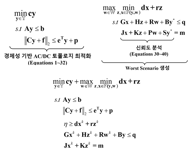 AC/DC 하이브리드 배전망 강건 설계 방안에서, 1단계 Master Problem(MP)은 경제성을 기반으로 초기 계획 방안을 제안한다. 각 구성은