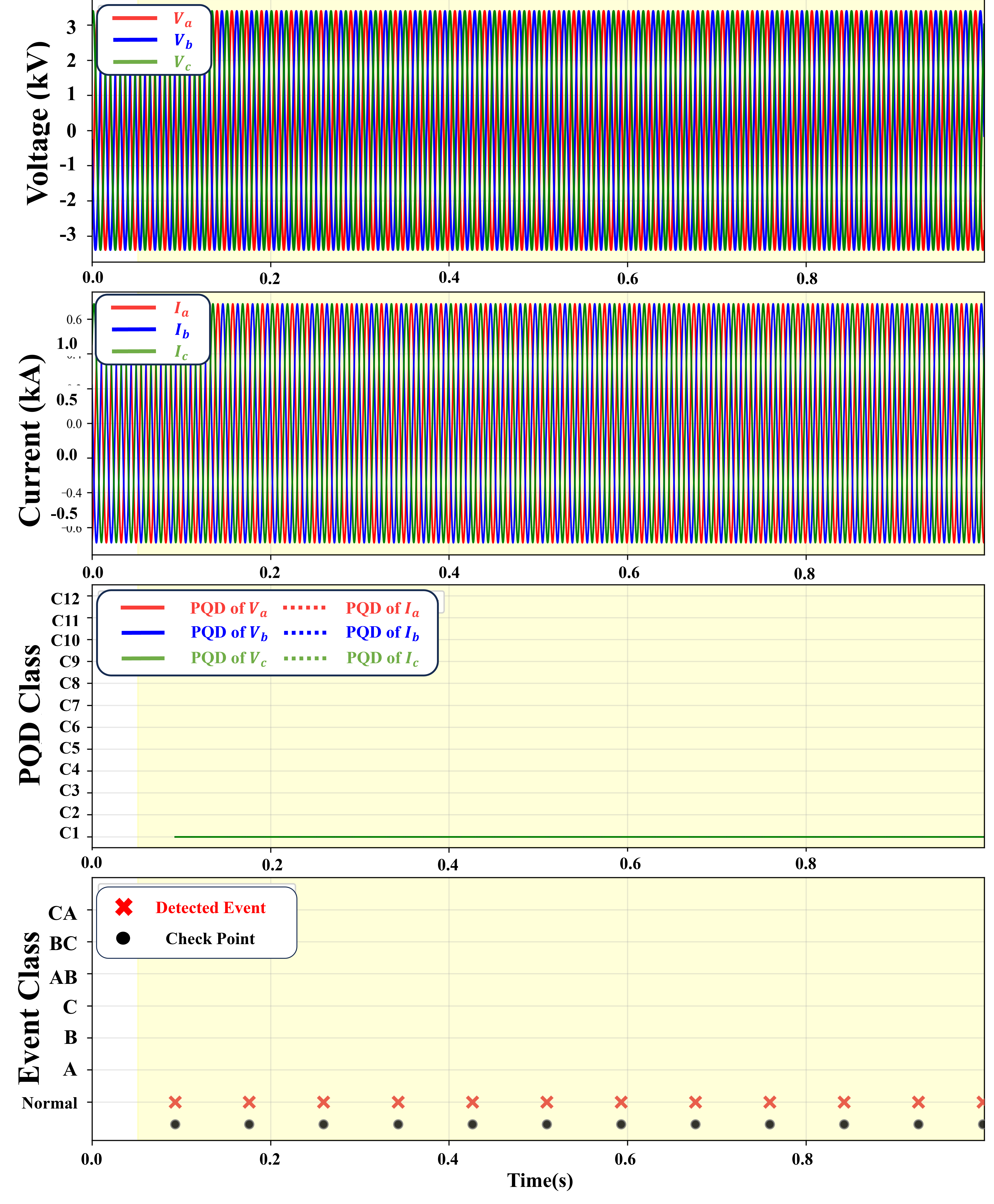 부하 모선에서 계측한 3상 전압 및 전류 시계열 데이터를 기반으로, 5주기(83.33ms) 길이의 슬라이딩 창을 적용하여 PQD를 감시한다. 이후