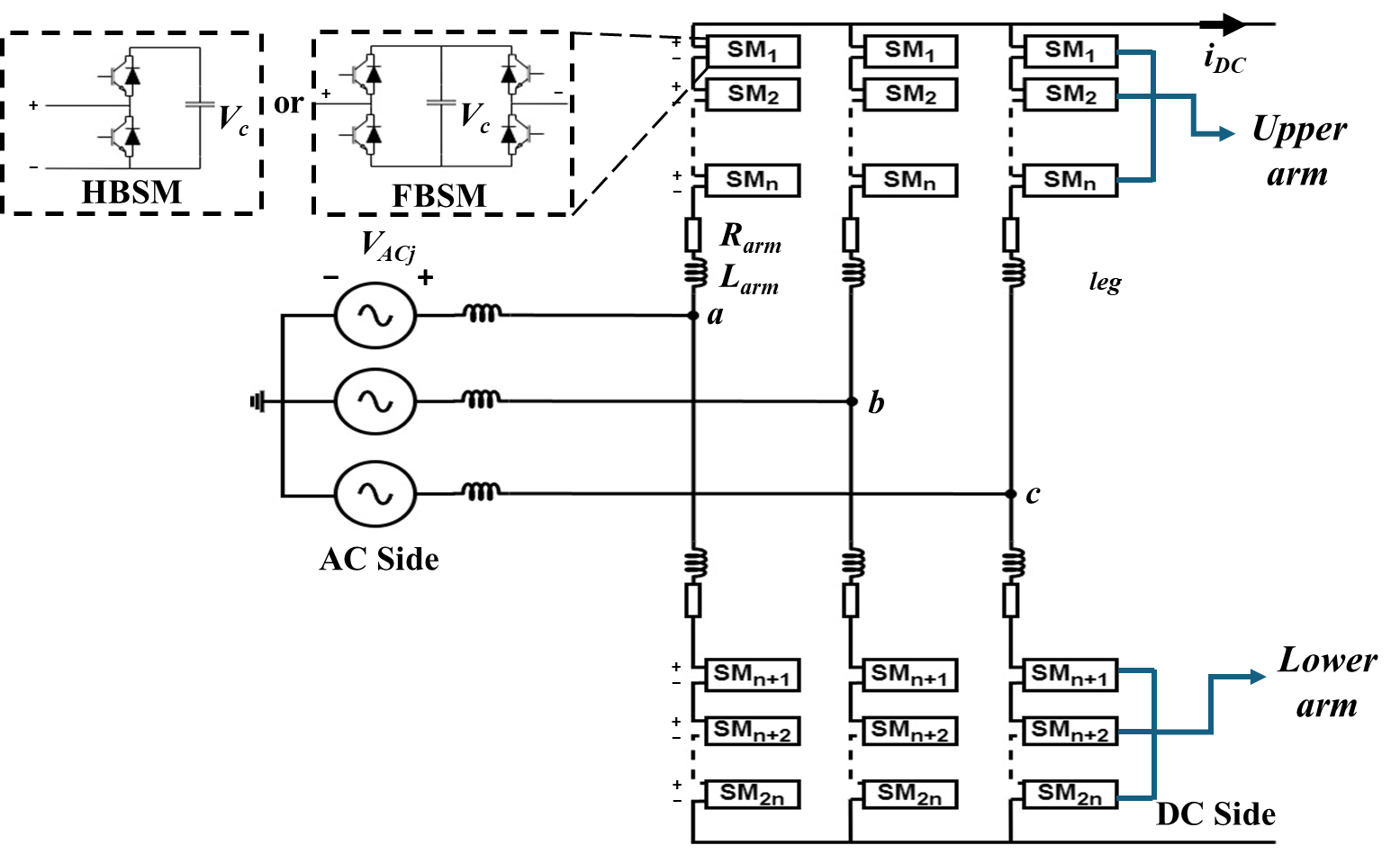구성되며, 각 SM에는 스위칭 소자와 커패시터가 포함된다. 또한 각 arm에는 전류 리플을 저감하고 단락 전류를 제한하는 인덕터와 저항이 포함되며,