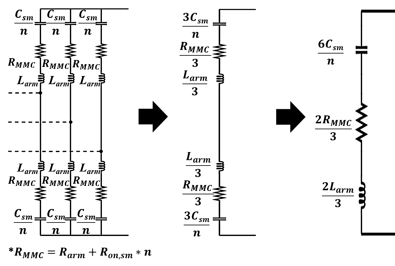 그림 2는 MMC의 RLC 등가회로 모델링 과정을 단계적으로 나타낸 것이다. MMC의 각 arm ($L_{a}$)은 여러 개의 SM ($C_{SM}$)으로