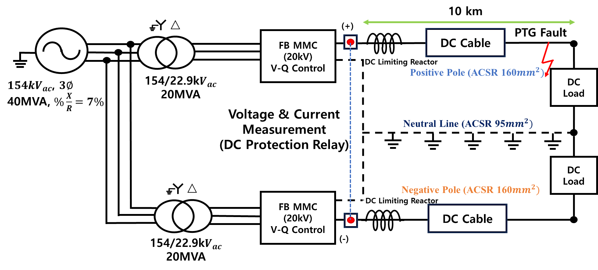 대응할 수 있다. 그러나 DC 계통의 경우 전류 영점(Zero-crossing)이 존재하지 않아 차단이 어렵고[2] 선로 임피던스가 낮아 고장 발생 시 전류가 수 밀리초 내에 급격히 상승한다. 이러한 특성으로 인해 고장 발생 시 10ms 이내에 고장 검출 및 차단이