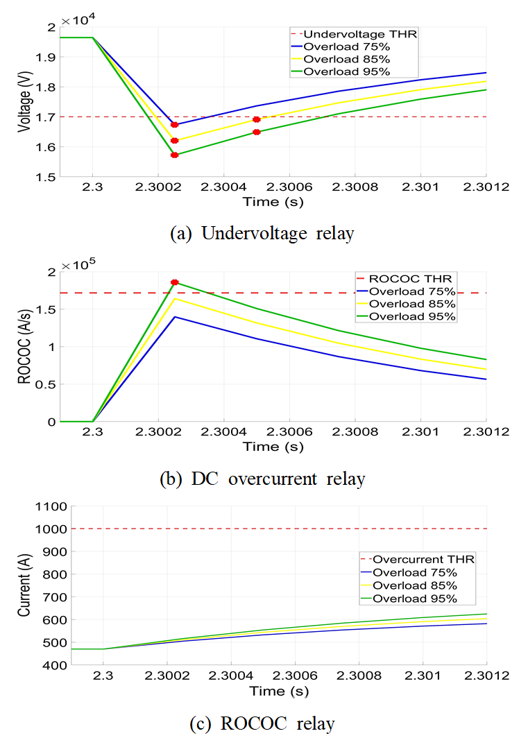 시뮬레이션 분석 결과, 부족전압 계전기와 ROCOC 계전기는 고장 조건 변화와 관계없이 모두 1.0ms 이내에 고장을 검출하였다. 반면, DC 과전류