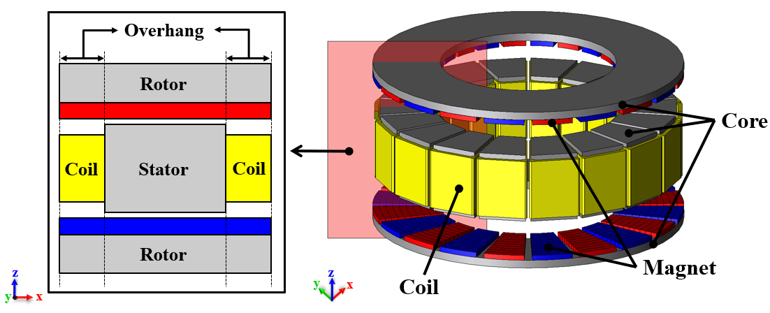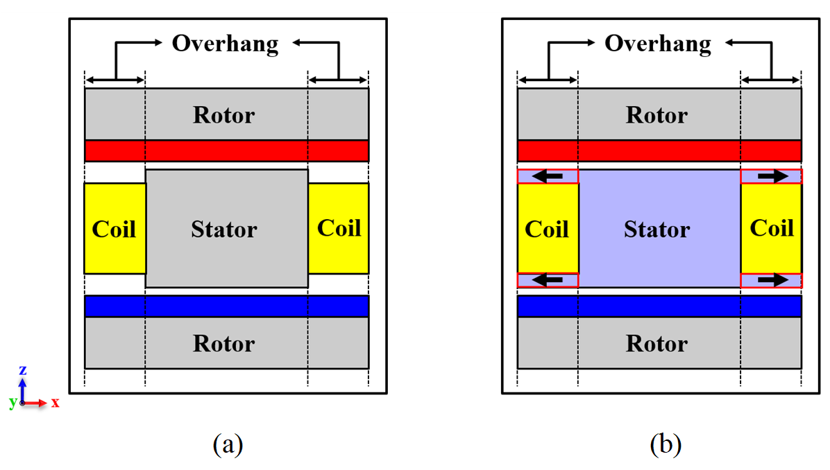 자속의 추가적인 공급원과 경로를 제공하는 회전자 오버행 구조를 적용할 경우, 기계의 크기를 확장하지 않고도 토크 및 출력 밀도와 같은 성능 지표를
