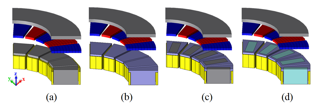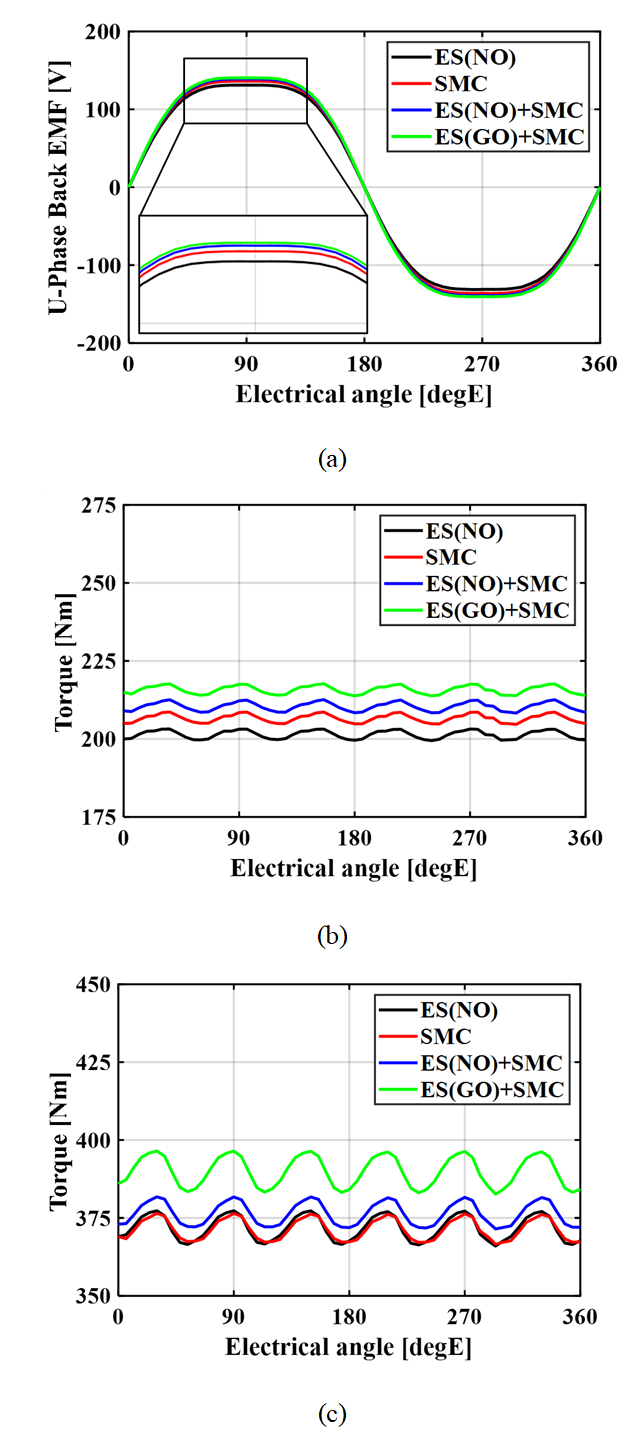 그러나 SMC는 낮은 자기 포화 밀도 및 높은 철손 특성을 가지므로 단독 적용 시 출력 저하라는 한계가 존재한다[6]. 이를 보완하기 위해 본 논문에서는 주 자속 경로에 전기강판 심을 삽입한 복합 코어 구조를 채택하였다. 또한 전동기의 성능을 한층 더 향상시키기