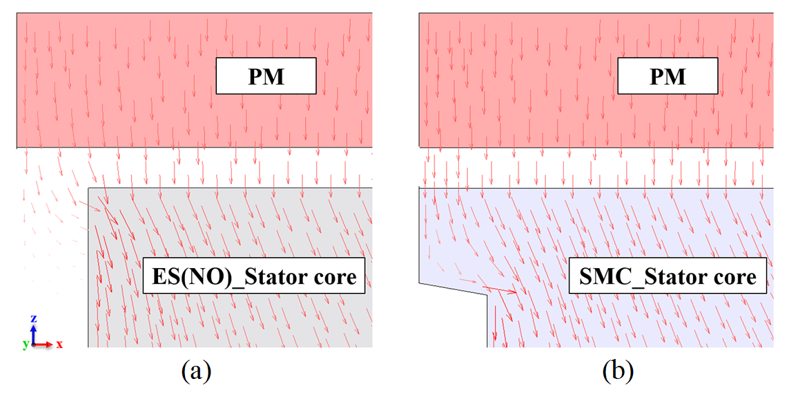 발생하는 자속을 기존 전기강판 모델보다 확장된 SMC 치-팁 구조가 보다 넓은 면적에서 수용하고, 효율적으로 집중시킴으로써 자속 쇄교를 증가시킨다.