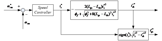 그림 8은 전류지령 변경부를 가지는 속도제어기이다. 속도오차로부터 $i_s^*$가 생성되고, 단위전류당 최대토크 제어에 의하여 $i_{ds\_mtpa}^{r*}$,