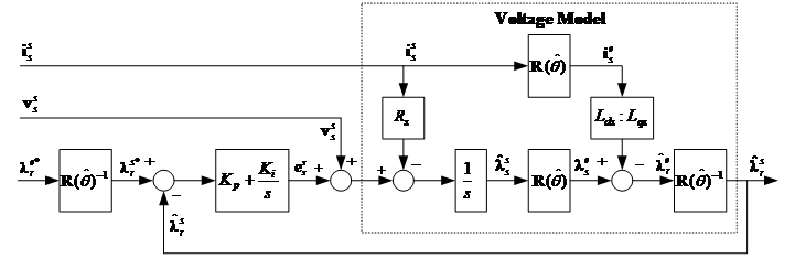 위의 두 식을 만족하는 동기좌표계 전류지령 $i_{ds}^{r*}, i_{qs}^{r*}$을 구해야 하는데 계산이 복잡하다. 그림 6에서 전류제한원과