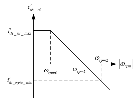 생성된다. 속도가 $\omega_{rpm1}$에서 $\omega_{rpm2}$까지는 $i_{ds\_nl}^r$값을 서서히 0 A에서 $i_{ds\_mpta\_min}^r$까지
