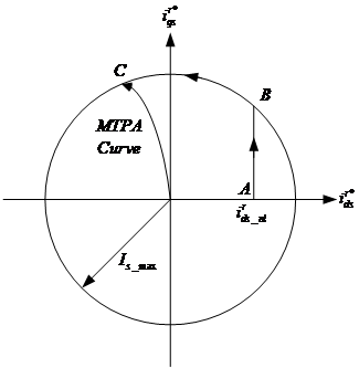 전류제한원을 따라 움직이면 토크가 비선형적으로 증가한다는 의미가 된다. 실제로는 비선형적으로 토크가 증가하게 되지만, 근사적으로 동기좌표계 d축 전류가
