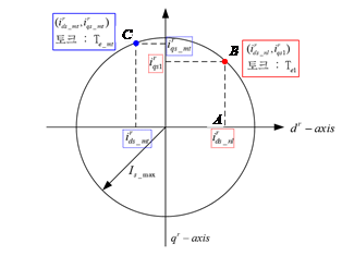 또, 전류제한원 $\sqrt{i_{ds}^{r*2} + i_{qs}^{r*2}} = I_{s\_max}$에서 MTPA 제어에 의하여 계산되는 동기좌표계