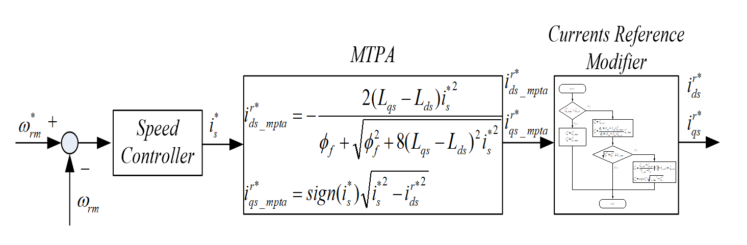 감소시킨다. 여기서 $i_{ds\_mpta\_min}^r$는 MTPA 제어에 의해 생성되는 d축 전류지령의 최소값을 의미한다. 그러므로 이 영역에서는