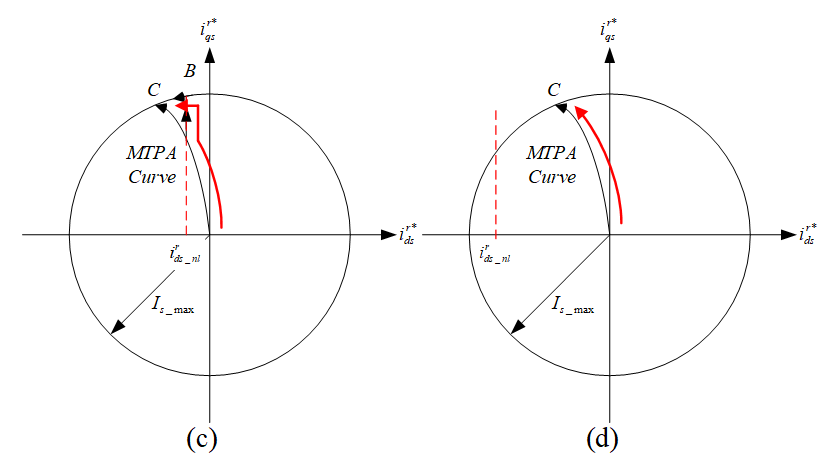 $i_{qs\_mt}^r$는 C점을 표시하고, $T_{e\_mt}$는 C점에 의하여 발생되는 토크를 의미하고 전류제한 조건을 만족하는 최대토크이며