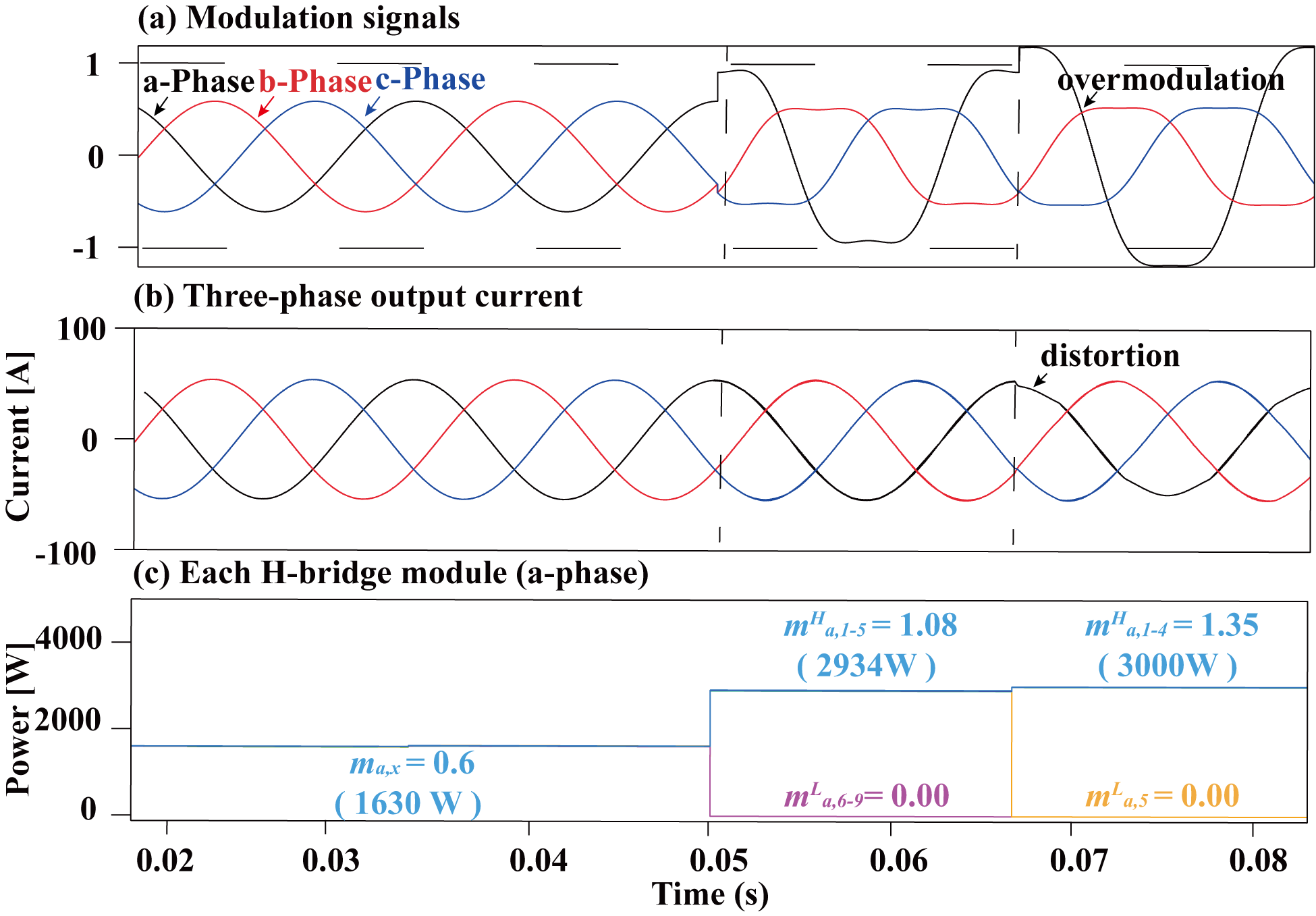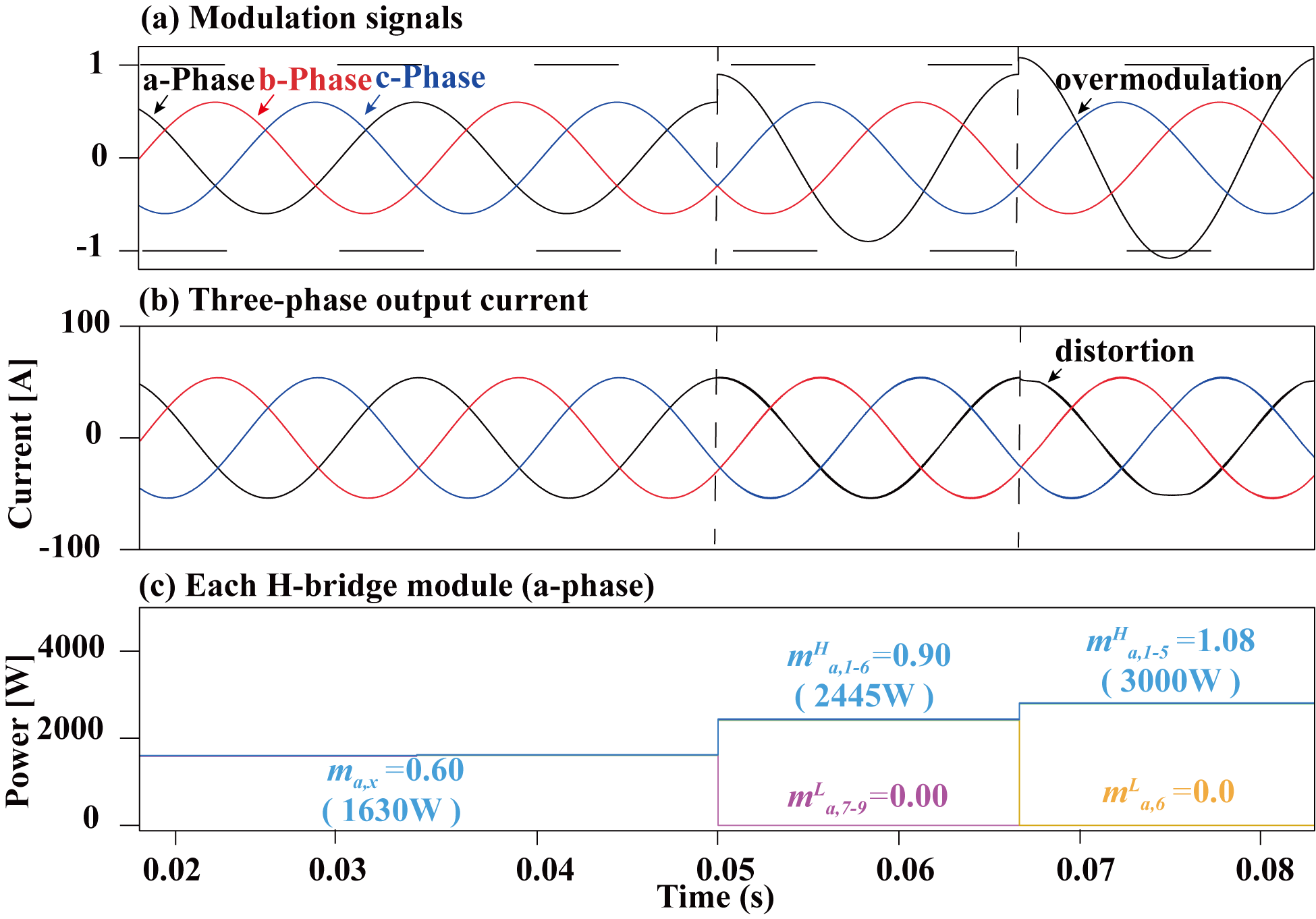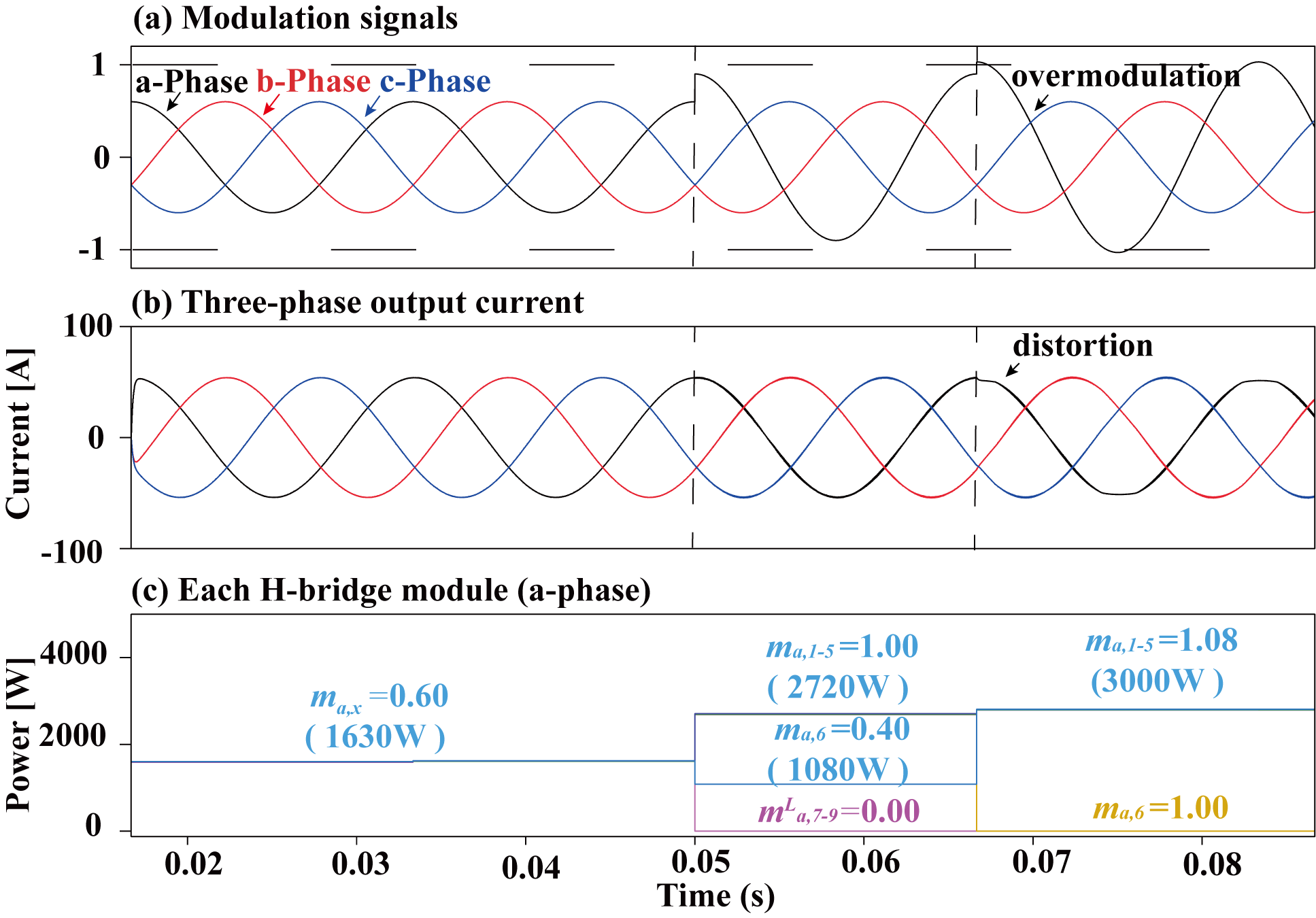 ๊ทธ๋ฆผ 17. ๋จ์ ๊ฐ๋ณ THIPWM ๊ธฐ๋ฒ์ ์ต๋ ๋ณ์กฐ ๋์ (๋ณ์กฐ์ง์๊ฐ 0.8์ธ ๊ฒฝ์ฐ): (a)์ง๋ น ์ ํธ, (b) ์ถ๋ ฅ์ ๋ฅ ๋ฐ (c) ๊ฐ ๋ชจ๋ ์ถ๋ ฅ