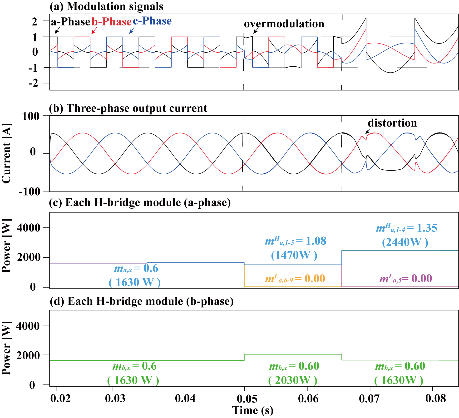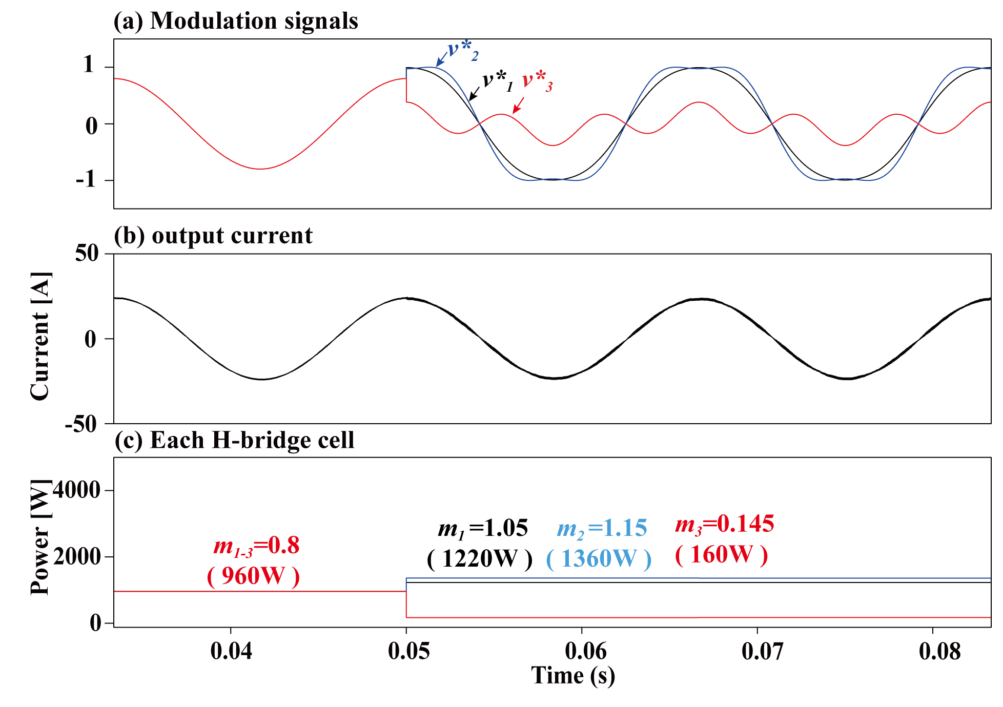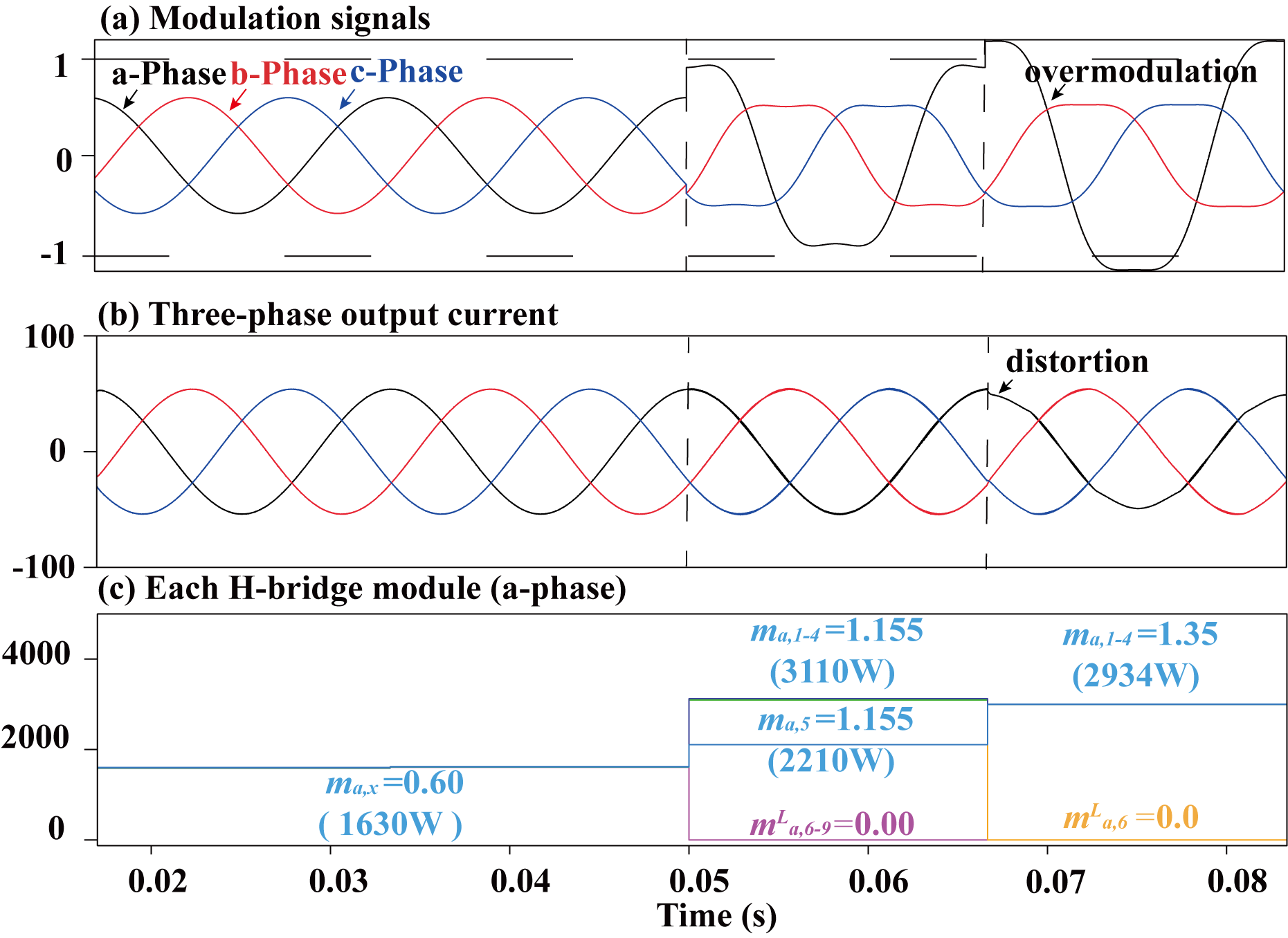 ๊ทธ๋ฆผ 17. ๋จ์ ๊ฐ๋ณ THIPWM ๊ธฐ๋ฒ์ ์ต๋ ๋ณ์กฐ ๋์ (๋ณ์กฐ์ง์๊ฐ 0.8์ธ ๊ฒฝ์ฐ): (a)์ง๋ น ์ ํธ, (b) ์ถ๋ ฅ์ ๋ฅ ๋ฐ (c) ๊ฐ ๋ชจ๋ ์ถ๋ ฅ