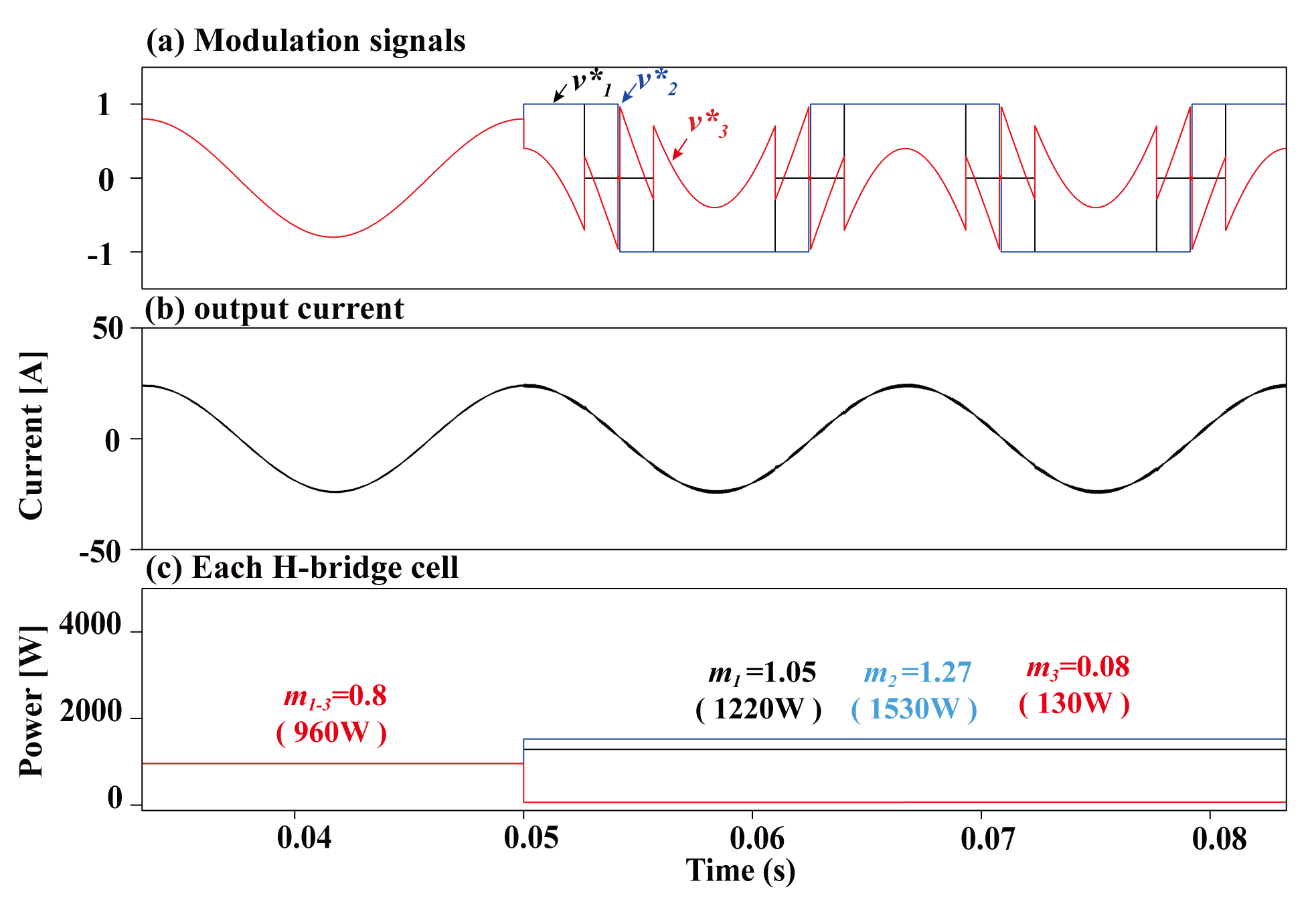 = 0.8): (a) Reference signal, (b) Output current, and (c) Output power of each module